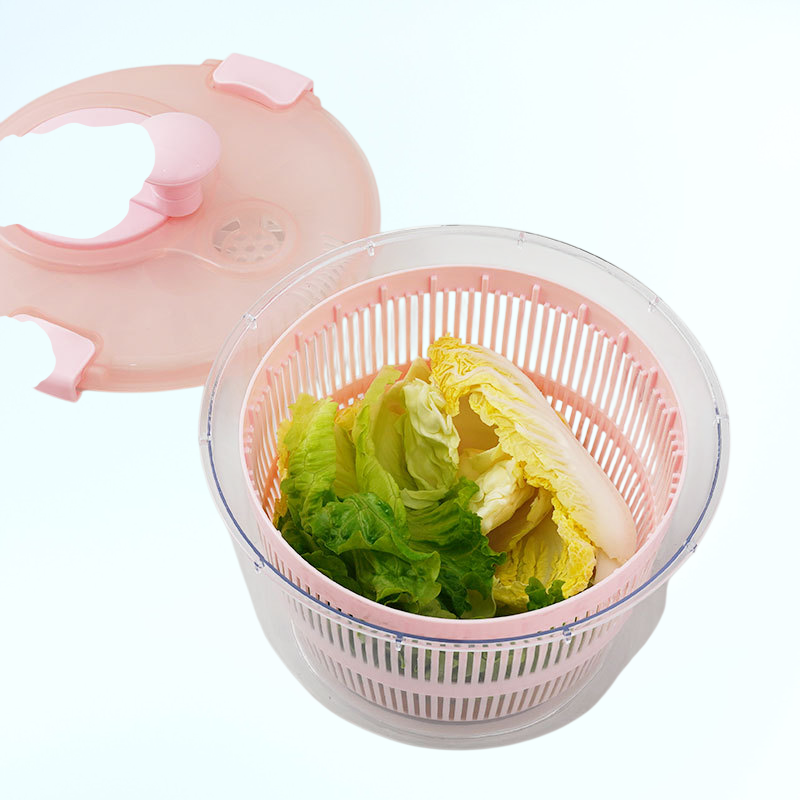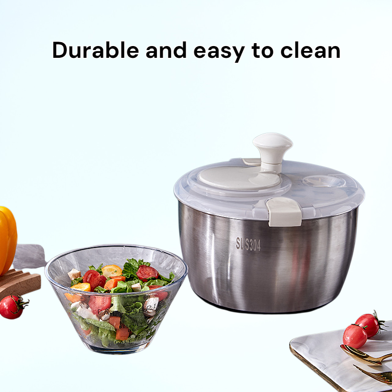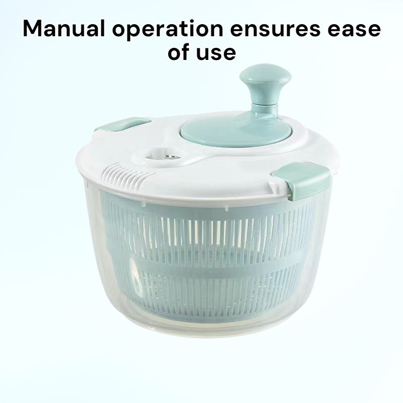 Efficiently dries salad, fruits, and vegetables; multi-functional design for dehydrating and draining; manual operation ensures easy use; durable and easy to clean; suitable for kitchens and meal prep.