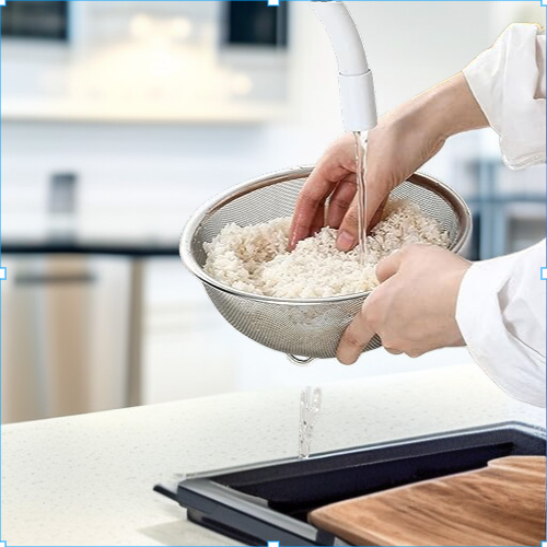 Stainless steel rice washer and vegetable sink drain basket, suitable for kitchen use. Durable, rust-resistant, easy to clean, and multi-functional for washing rice, fruits, and vegetables. Efficient drainage design.