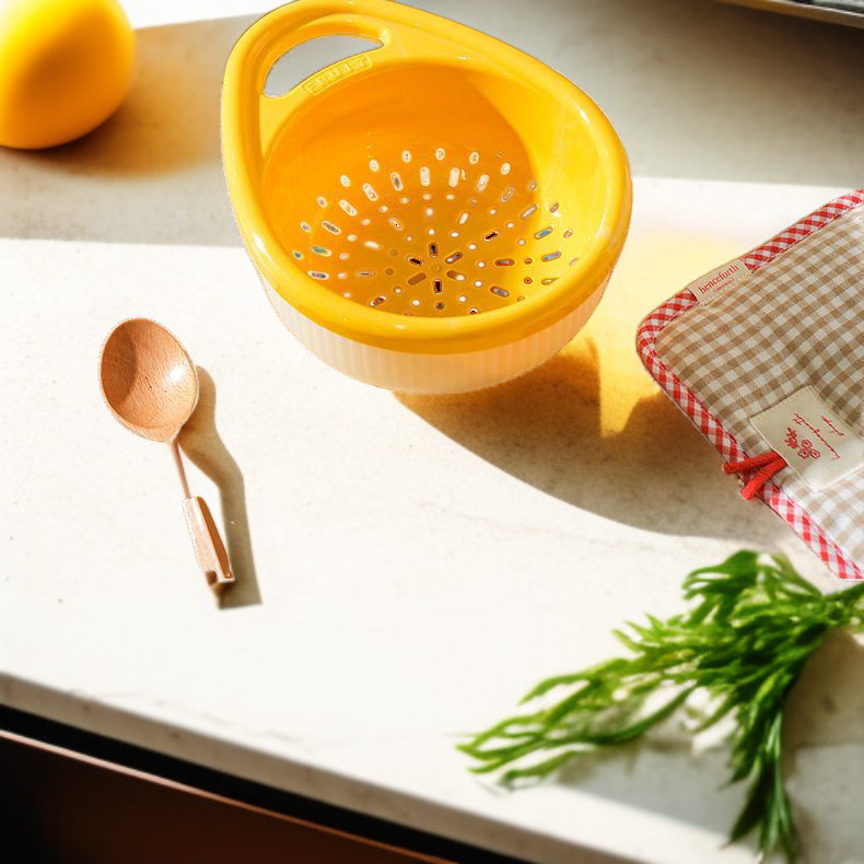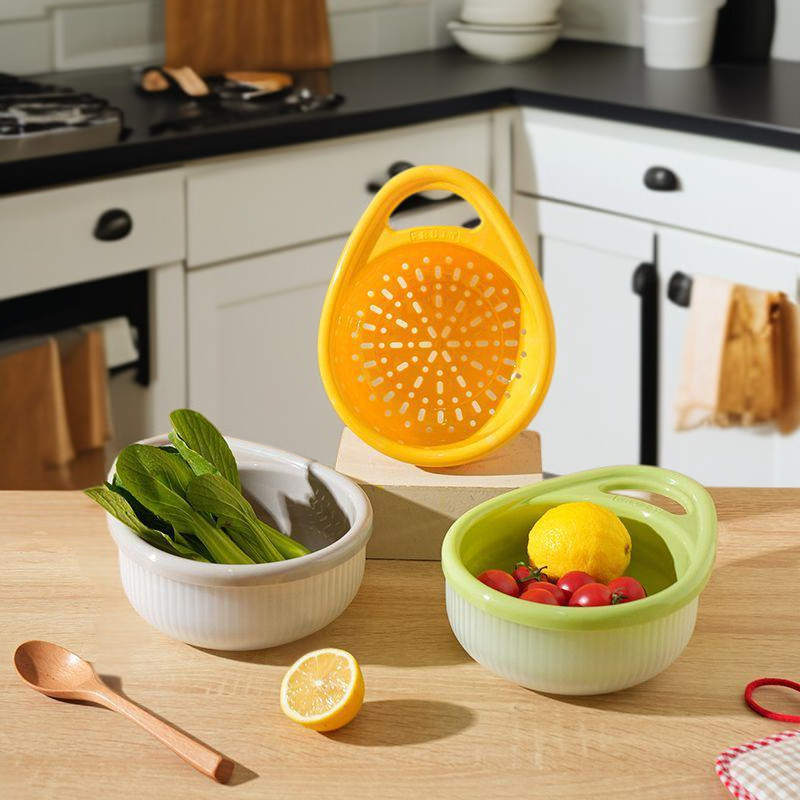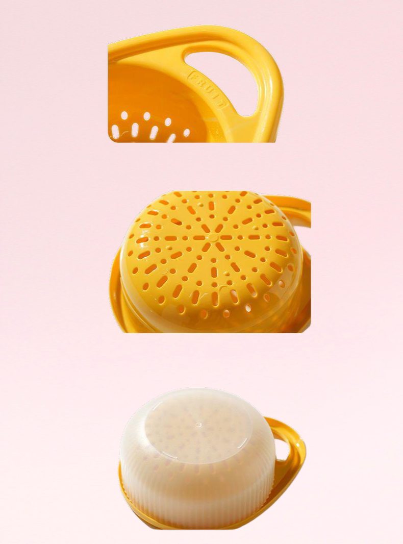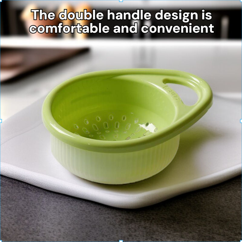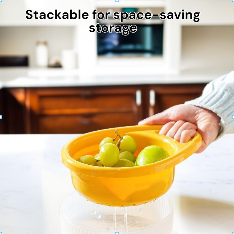 Double layer handle drain basket kitchen offers efficient water drainage, durable material, easy-to-clean design, space-saving stackable structure, and comfortable double handles for convenient use. Suitable for washing fruits, vegetables, and draining pasta.
